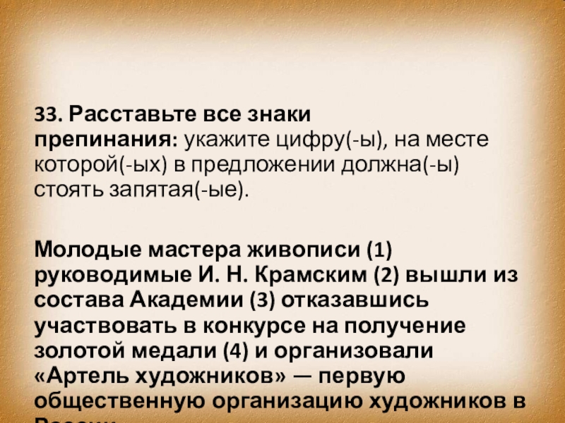 Молодые мастера живописи (1) руководимые И. Н. Крамским (2) вышли из состава Академии (3) отказавшись участвовать в конкурсе на получение золотой медали (4) и организовали «Артель художников» — первую общественную организацию художников в России.