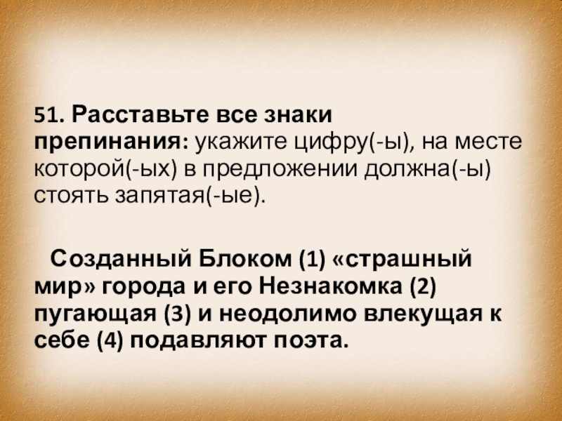 Слайд 5041. Расставьте все знаки препинания: укажите цифру(-ы), на месте которой(-ых) в предложении должна(-ы)