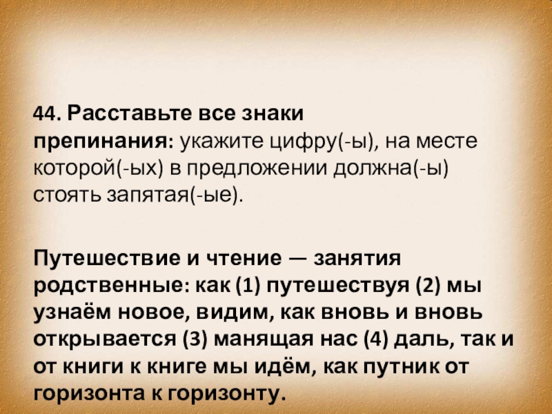 Путешествие и чтение — занятия родственные: как (1) путешествуя (2) мы узнаём новое, видим, как вновь и вновь открывается (3) манящая нас (4) даль, так и от книги к книге мы идём, как путник от горизонта к горизонту.