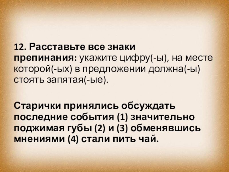 Старички принялись обсуждать последние события (1) значительно поджимая губы (2) и (3) обменявшись мнениями (4) стали пить чай.