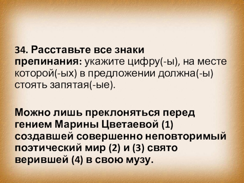 Можно лишь преклоняться перед гением Марины Цветаевой (1) создавшей совершенно неповторимый поэтический мир (2) и (3) свято верившей (4) в свою музу.