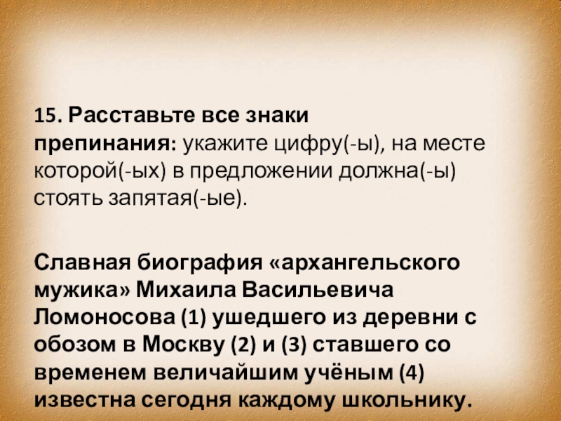 Славная биография «архангельского мужика» Михаила Васильевича Ломоносова (1) ушедшего из деревни с обозом в Москву (2) и (3) ставшего со временем величайшим учёным (4) известна сегодня каждому школьнику.