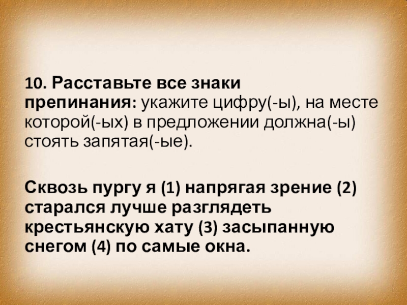 Слайд 1910. Расставьте все знаки препинания: укажите цифру(-ы), на месте которой(-ых) в предложении должна(-ы)