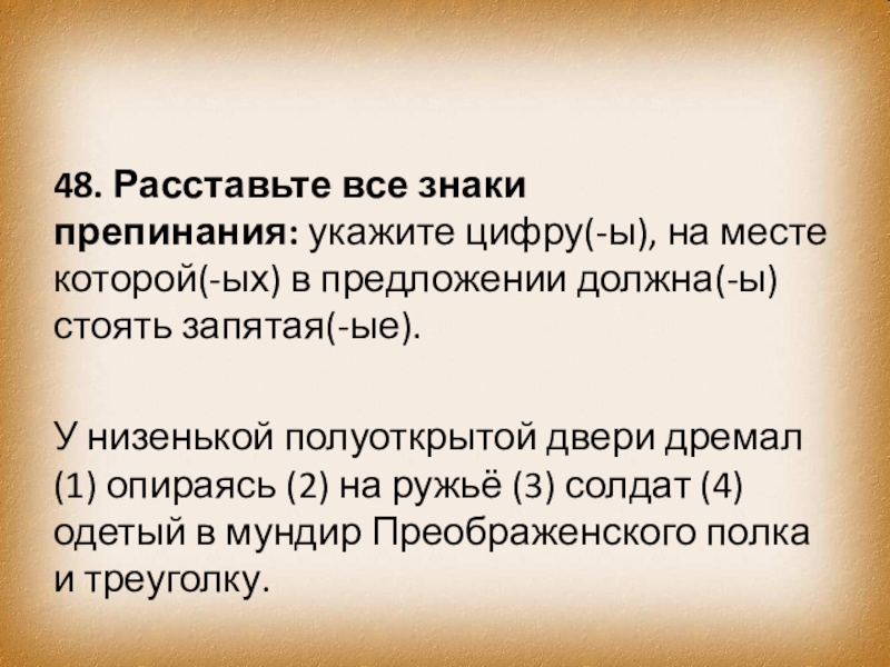 У низенькой полуоткрытой двери дремал (1) опираясь (2) на ружьё (3) солдат (4) одетый в мундир Преображенского полка и треуголку.