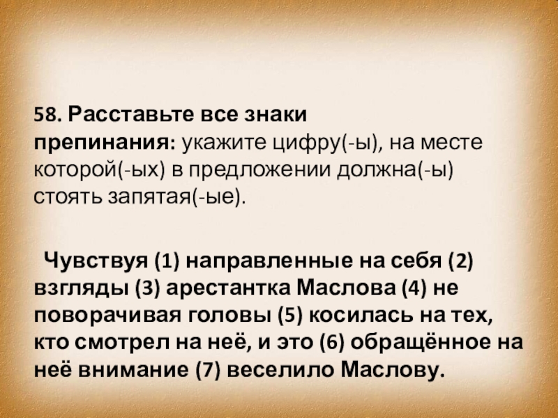 Чувствуя (1) направленные на себя (2) взгляды (3) арестантка Маслова (4) не поворачивая головы (5) косилась на тех, кто смотрел на неё, и это (6) обращённое на неё внимание (7) веселило Маслову.