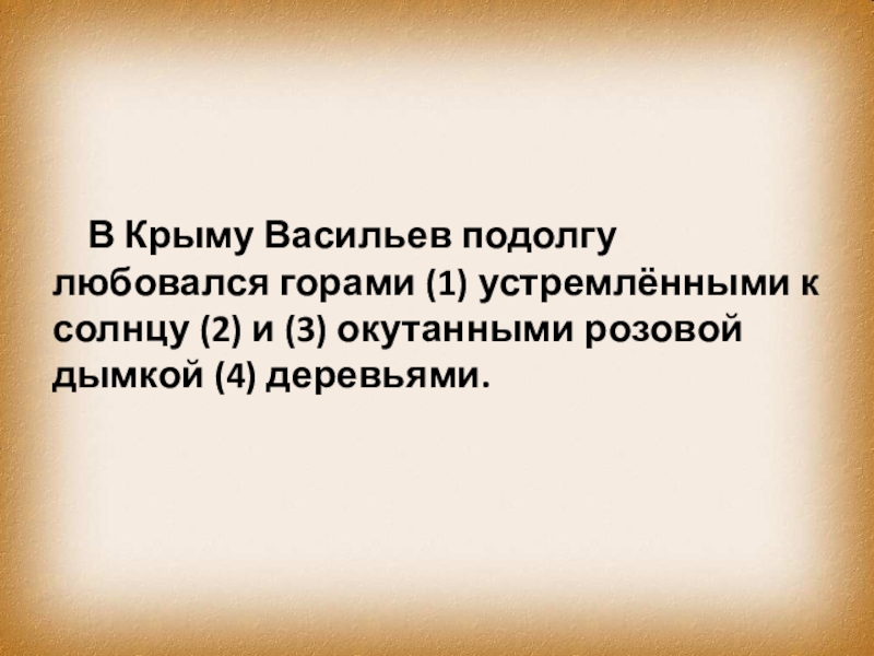 В Крыму Васильев подолгу любовался горами (1) устремлёнными к солнцу (2) и (3) окутанными розовой дымкой (4) деревьями.