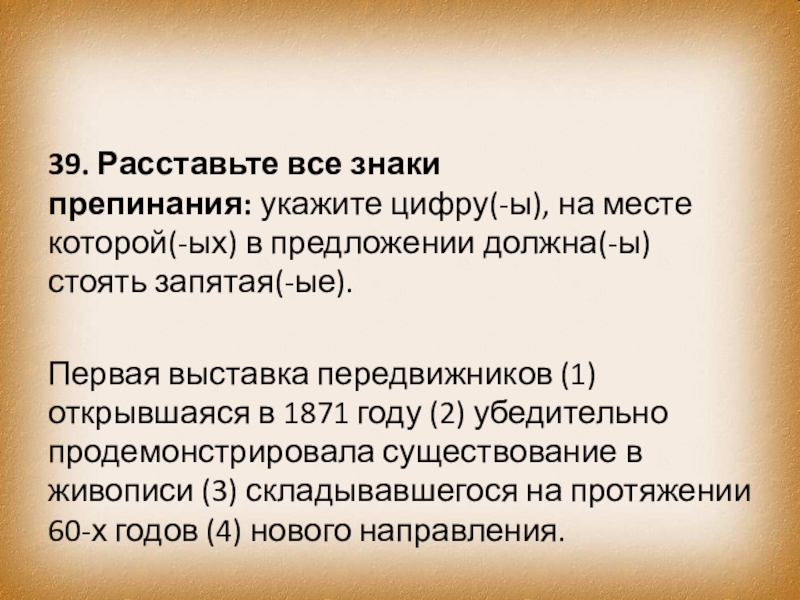 Первая выставка передвижников (1) открывшаяся в 1871 году (2) убедительно продемонстрировала существование в живописи (3) складывавшегося на протяжении 60-х годов (4) нового направления.