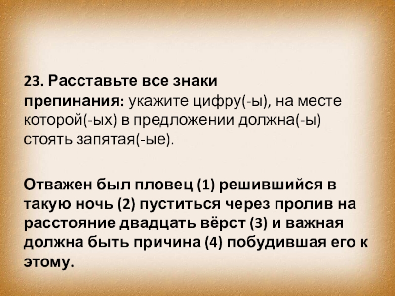 Отважен был пловец (1) решившийся в такую ночь (2) пуститься через пролив на расстояние двадцать вёрст (3) и важная должна быть причина (4) побудившая его к этому.