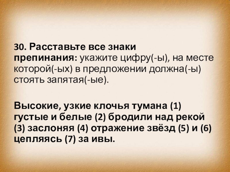 Слайд 3930. Расставьте все знаки препинания: укажите цифру(-ы), на месте которой(-ых) в предложении должна(-ы)