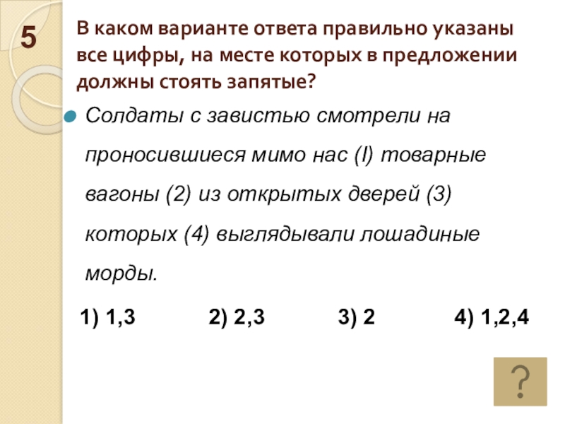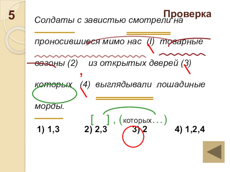Солдаты с завистью смотрели на проносившиеся мимо нас (I) товарные вагоны (2) из открытых дверей (3) которых (4) выглядывали лошадиные морды.