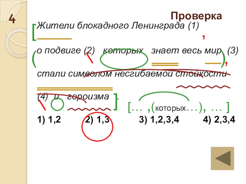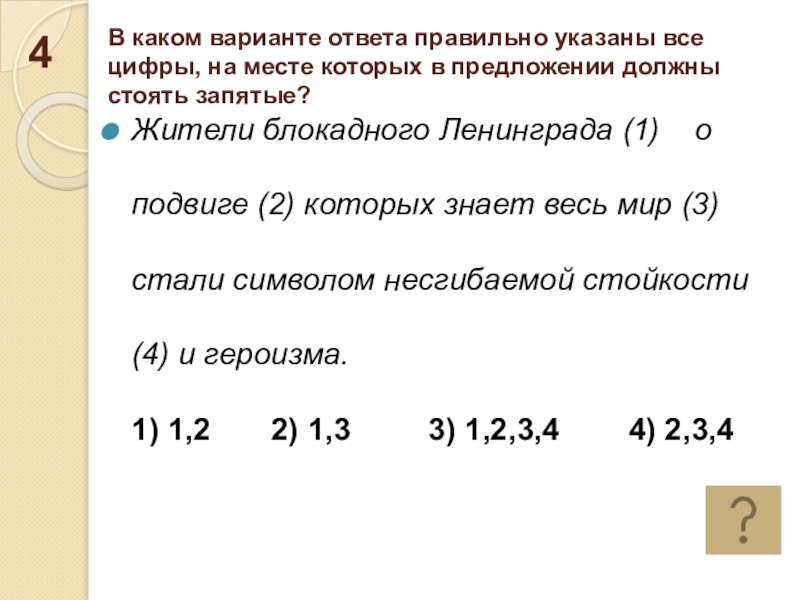 Жители блокадного Ленинграда (1) о подвиге (2) которых знает весь мир (3) стали символом несгибаемой стойкости (4) и героизма.