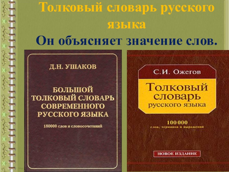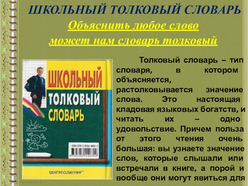 Толковый словарь – тип словаря, в котором объясняется, растолковывается значение слова. Это настоящая кладовая языковых богатств, и читать их – одно удовольствие. Причем польза от этого чтения очень большая: вы узнаете значение слов, которые слышали или встречали в книге, а порой и вообще они могут явиться для вас открытием.