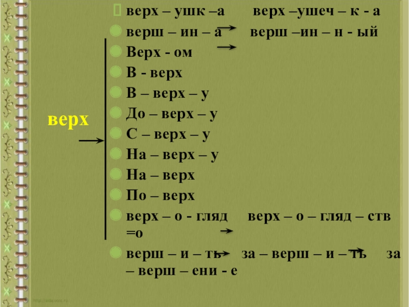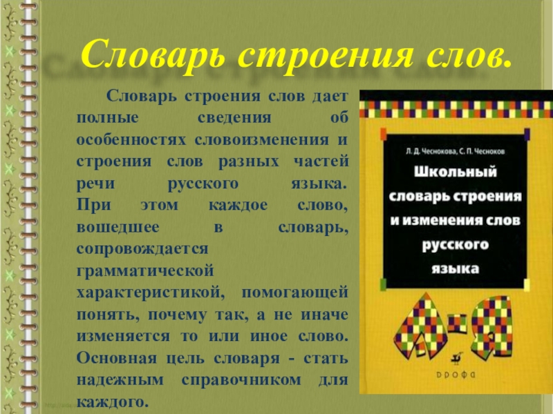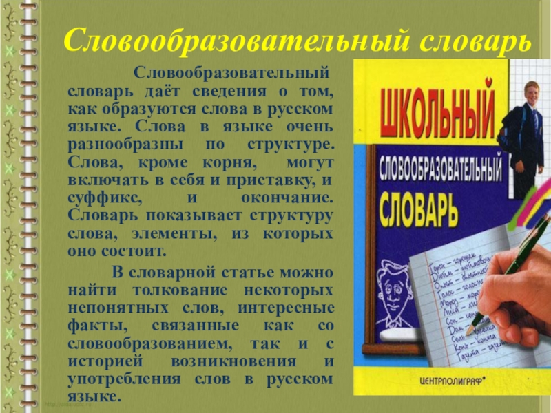 образуются слова в русском языке. Слова в языке очень разнообразны по структуре. Слова, кроме корня, могут включать в себя и приставку, и суффикс, и окончание. Словарь показывает структуру слова, элементы, из которых оно состоит.