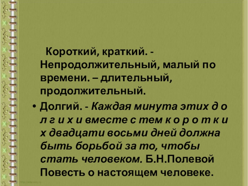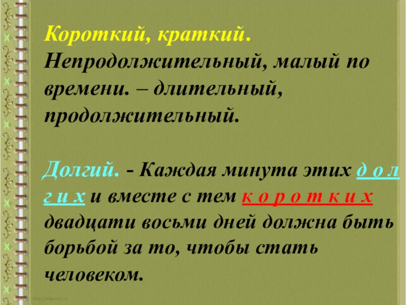 Слайд 16Короткий, краткий. Непродолжительный, малый по времени. – длительный, продолжительный.