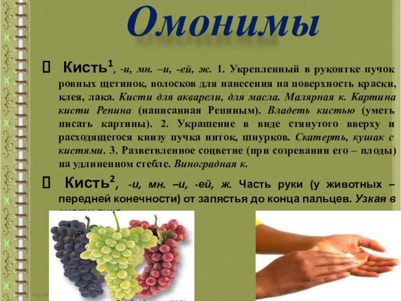 Слайд 10 Кисть1, -и, мн. –и, -ей, ж. 1. Укрепленный в рукоятке