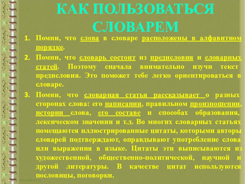 Помни, что словарная статья рассказывает о разных сторонах слова: его написании, правильном произношении, истории слова, его составе и способах образования, лексическом значении и т.д. Во многих словарных статьях помещаются иллюстрированные цитаты, которыми авторы словарей подтверждают, оправдывают употребление слова или выражения в языке. Цитаты эти выписываются из художественной, общественно-политической, научной и другой литературы. В качестве цитат используются пословицы, поговорки.