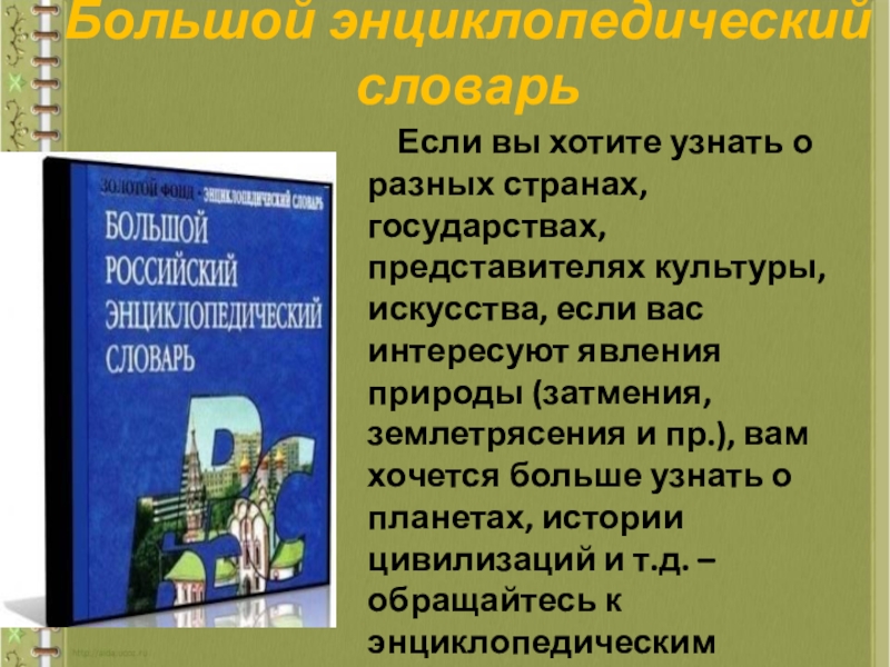 разных странах, государствах, представителях культуры, искусства, если вас интересуют явления природы (затмения, землетрясения и пр.), вам хочется больше узнать о планетах, истории цивилизаций и т.д. – обращайтесь к энциклопедическим словарям. В них вы найдете ответы на вопросы из разных областей знаний.