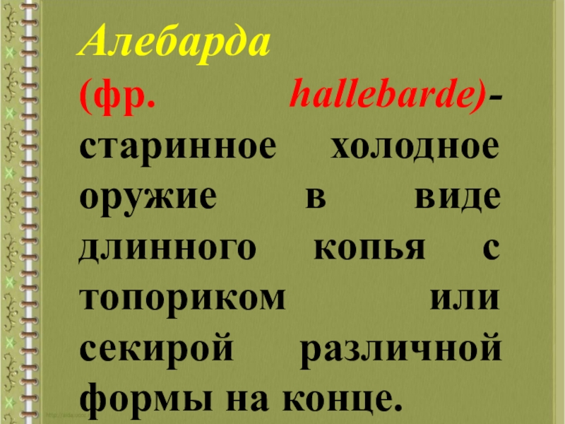 (фр. hallebarde)-старинное холодное оружие в виде длинного копья с топориком