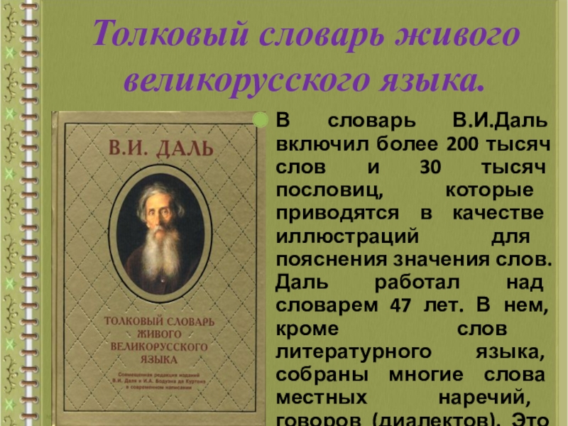 слов и 30 тысяч пословиц, которые приводятся в качестве иллюстраций для пояснения значения слов. Даль работал над словарем 47 лет. В нем, кроме слов литературного языка, собраны многие слова местных наречий, говоров (диалектов). Это настоящий подвиг человека, влюбленного в русский язык.