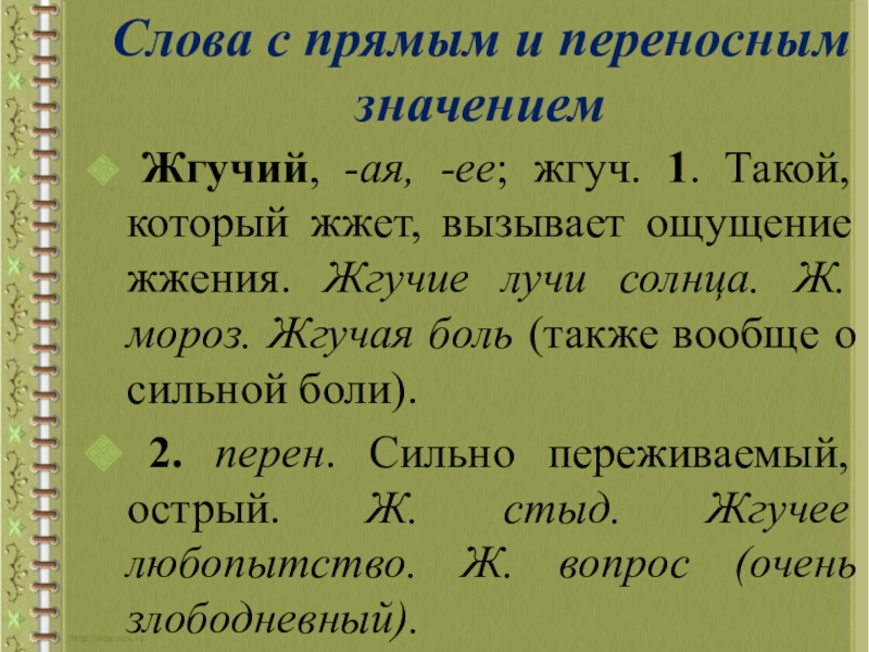 Слайд 9 Жгучий, -ая, -ее; жгуч. 1. Такой, который жжет, вызывает ощущение
