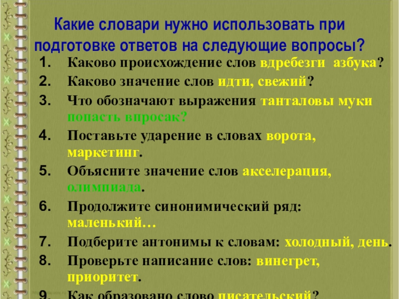 Слайд 32Какие словари нужно использовать при подготовке ответов на следующие вопросы?