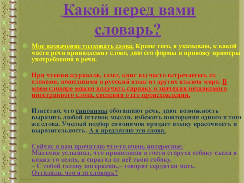 Словарь синонимов содержит ряды синонимов. Он помогает подобрать наиболее удачное слово или словосочетание для более точного и яркого выражения мысли. Каждая словарная статья представляет собой перечень слов – синонимов, их толкование и примеры из литературно – художественных произведений. Синонимы расширяют словарный состав языка, делают его ярче, выразительнее, разнообразнее.