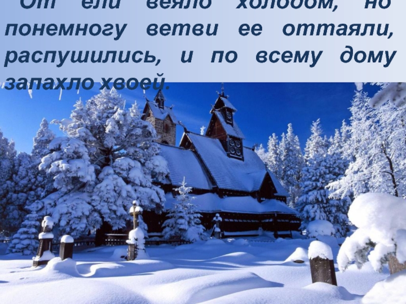 Слайд 7 От ели веяло холодом, но понемногу ветви ее оттаяли, распушились,