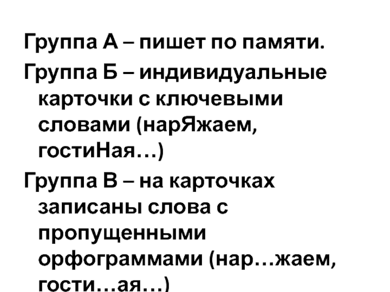 Группа А – пишет по памяти.Группа Б – индивидуальные карточки с ключевыми словами (нарЯжаем, гостиНая…)Группа В –
