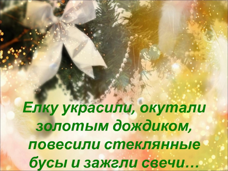 Слайд 15 Елку украсили, окутали золотым дождиком, повесили стеклянные бусы и зажгли
