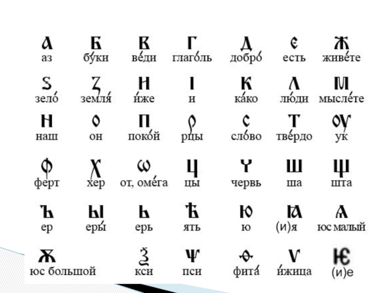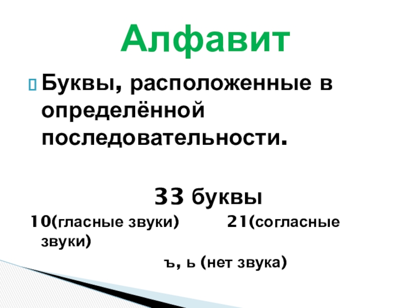 Буквы, расположенные в определённой последовательности.33 буквы10(гласные звуки)     21(согласные звуки)