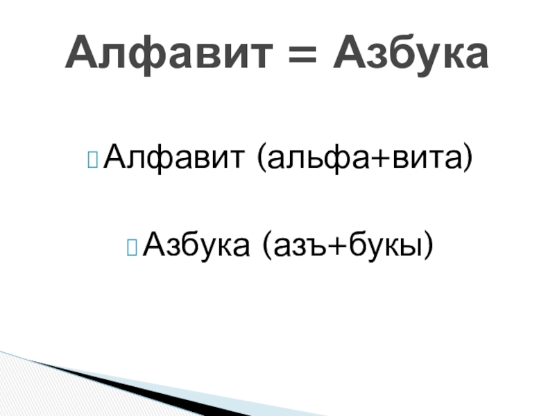Алфавит (альфа+вита)Азбука (азъ+букы)Алфавит = Азбука