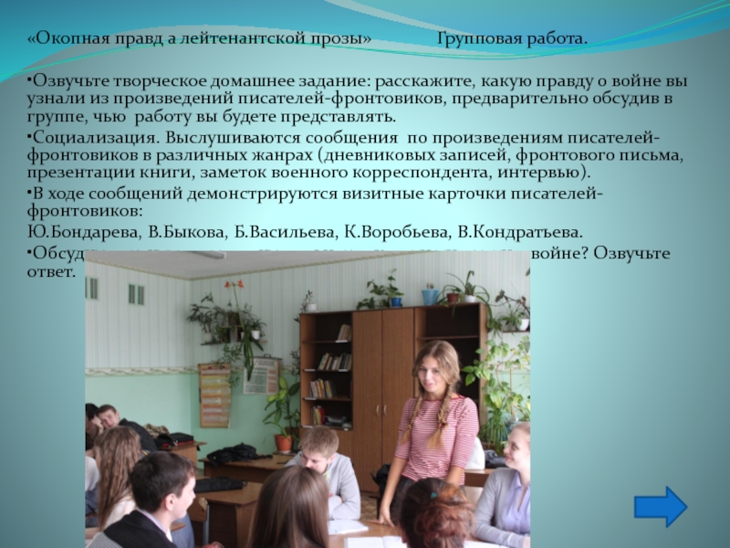 •Озвучьте творческое домашнее задание: расскажите, какую правду о войне вы узнали из произведений писателей-фронтовиков, предварительно обсудив в группе, чью работу вы будете представлять.