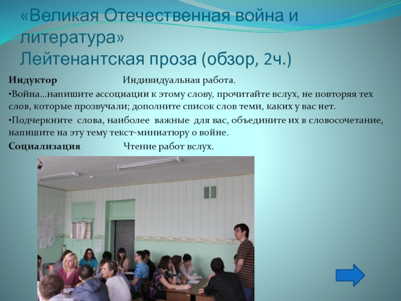 •Социализация. Выслушиваются сообщения по произведениям писателей-фронтовиков в различных жанрах (дневниковых записей, фронтового письма, презентации книги, заметок военного корреспондента, интервью).