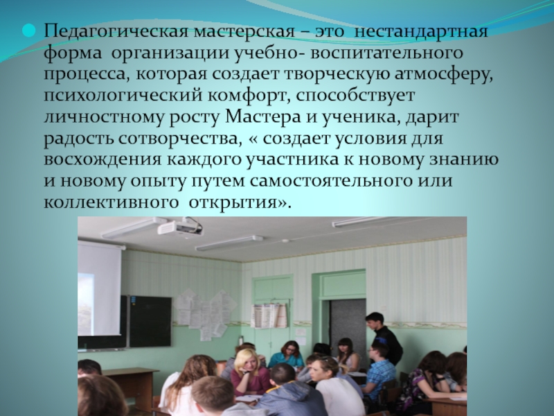 Слайд 6Педагогическая мастерская – это нестандартная форма организации учебно- воспитательного процесса, которая