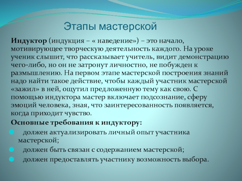 – « наведение») – это начало, мотивирующее творческую деятельность каждого. На уроке ученик слышит, что рассказывает учитель, видит демонстрацию чего-либо, но он не затронут личностно, не побужден к размышлению. На первом этапе мастерской построения знаний надо найти такое действие, чтобы каждый участник мастерской «зажил» в ней, ощутил предложенную тему как свою. С помощью индуктора мастер включает подсознание, сферу эмоций человека, зная, что заинтересованность появляется, когда приходит чувство.