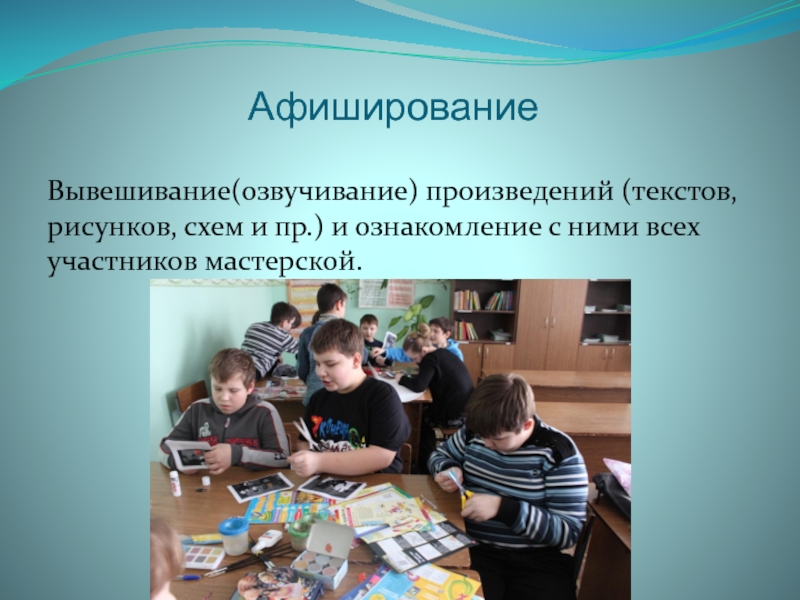 Вывешивание(озвучивание) произведений (текстов, рисунков, схем и пр.) и ознакомление с ними всех участников мастерской.
