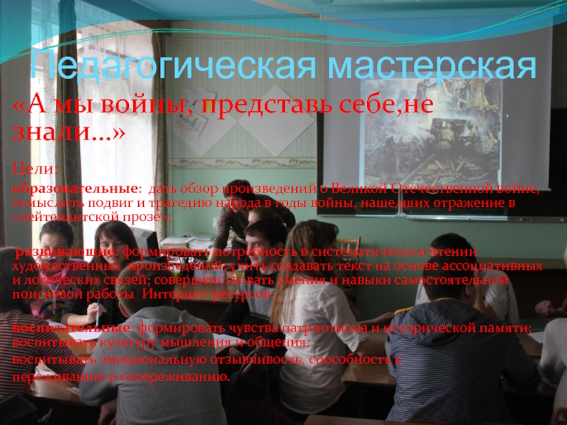 о Великой Отечественной войне, осмыслить подвиг и трагедию народа в годы войны, нашедших отражение в «лейтенантской прозе»;