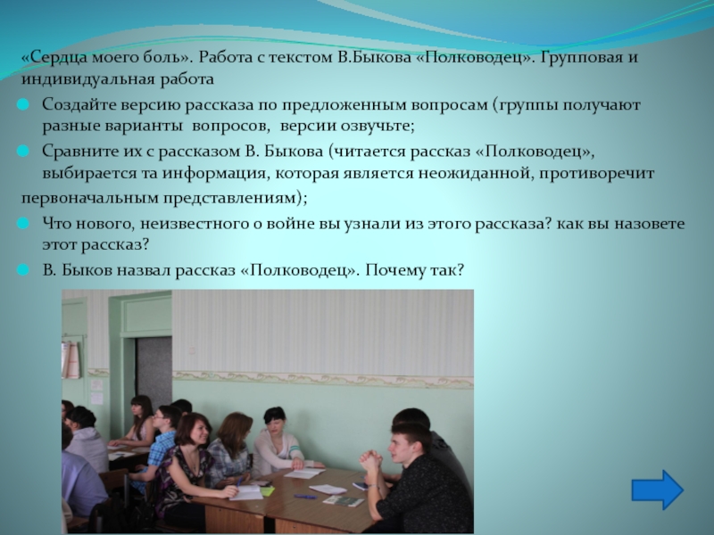 Слайд 18«Сердца моего боль». Работа с текстом В.Быкова «Полководец». Групповая и индивидуальная