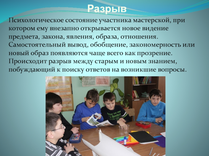 Психологическое состояние участника мастерской, при котором ему внезапно открывается новое видение предмета, закона, явления, образа, отношения. Самостоятельный вывод, обобщение, закономерность или новый образ появляются чаще всего как прозрение. Происходит разрыв между старым и новым знанием, побуждающий к поиску ответов на возникшие вопросы.