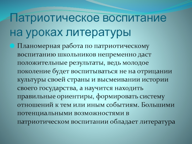 даст положительные результаты, ведь молодое поколение будет воспитываться не на отрицании культуры своей страны и высмеивании истории своего государства, а научится находить правильные ориентиры, формировать систему отношений к тем или иным событиям. Большими потенциальными возможностями в патриотическом воспитании обладает литература