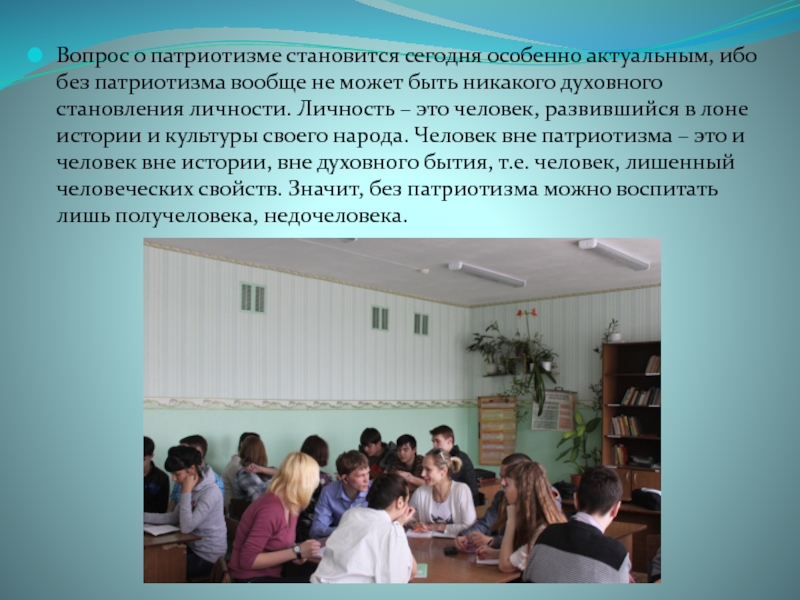 Слайд 4Вопрос о патриотизме становится сегодня особенно актуальным, ибо без патриотизма вообще