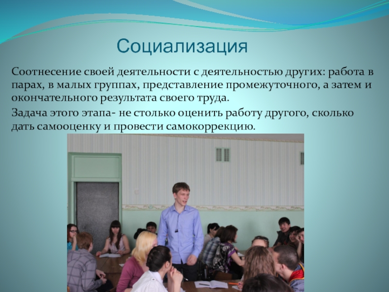 Соотнесение своей деятельности с деятельностью других: работа в парах, в малых группах, представление промежуточного, а затем и окончательного результата своего труда.