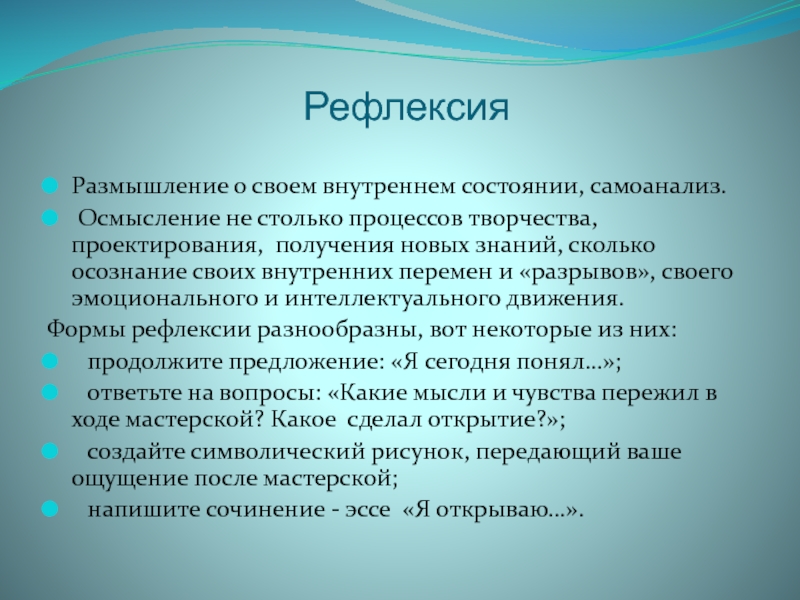 Осмысление не столько процессов творчества, проектирования, получения новых знаний, сколько осознание своих внутренних перемен и «разрывов», своего эмоционального и интеллектуального движения.