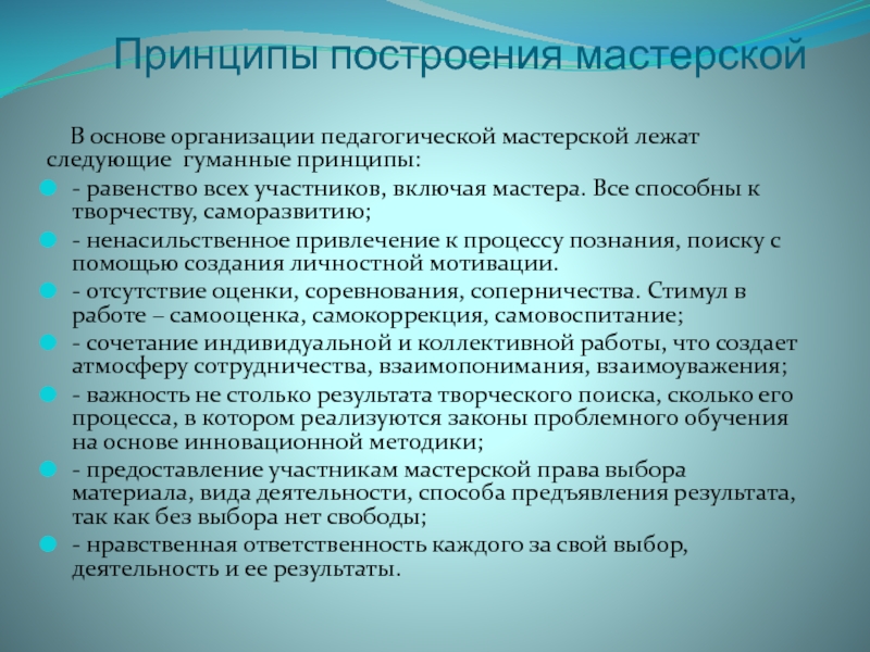 организации педагогической мастерской лежат следующие гуманные принципы: