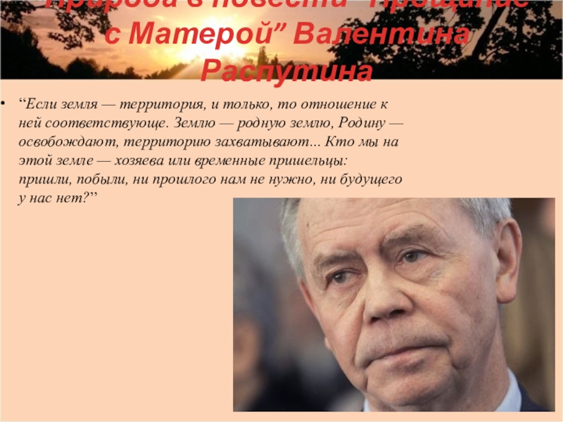 Получилось так, что природа выполнила божественную задачу: призвала грешника к покаянию и за это отпустила ему грех. Автор оставляет надежду на жизнь без греха не только своему герою, но и нам всем, потому что никто на земле не застрахован от конфликтов с природой, а значит, и с собственной душой.