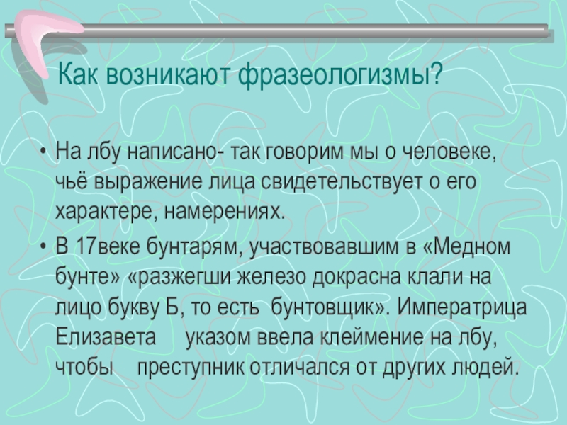 В 17веке бунтарям, участвовавшим в «Медном бунте» «разжегши железо докрасна клали на лицо букву Б, то есть бунтовщик». Императрица Елизавета указом ввела клеймение на лбу,чтобы преступник отличался от других людей.