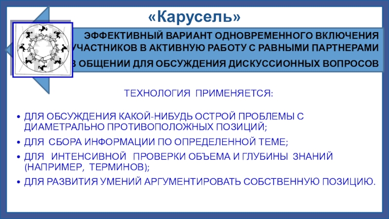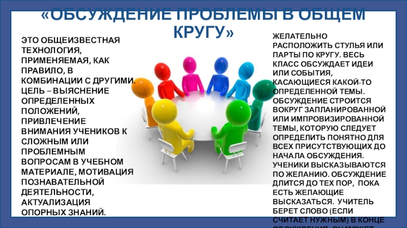 ЖЕЛАТЕЛЬНО РАСПОЛОЖИТЬ СТУЛЬЯ ИЛИ ПАРТЫ ПО КРУГУ. ВЕСЬ КЛАСС ОБСУЖДАЕТ ИДЕИ ИЛИ СОБЫТИЯ, КАСАЮЩИЕСЯ КАКОЙ-ТО ОПРЕДЕЛЕННОЙ ТЕМЫ. ОБСУЖДЕНИЕ СТРОИТСЯ ВОКРУГ ЗАПЛАНИРОВАННОЙ ИЛИ ИМПРОВИЗИРОВАННОЙ ТЕМЫ, КОТОРУЮ СЛЕДУЕТ ОПРЕДЕЛИТЬ ПОНЯТНО ДЛЯ ВСЕХ ПРИСУТСТВУЮЩИХ ДО НАЧАЛА ОБСУЖДЕНИЯ. УЧЕНИКИ ВЫСКАЗЫВАЮТСЯ ПО ЖЕЛАНИЮ. ОБСУЖДЕНИЕ ДЛИТСЯ ДО ТЕХ ПОР, ПОКА ЕСТЬ ЖЕЛАЮЩИЕ ВЫСКАЗАТЬСЯ. УЧИТЕЛЬ БЕРЕТ СЛОВО (ЕСЛИ СЧИТАЕТ НУЖНЫМ) В КОНЦЕ ОБСУЖДЕНИЯ. ОН МОЖЕТ ВЫСКАЗАТЬ СВОЕ МНЕНИЕ.