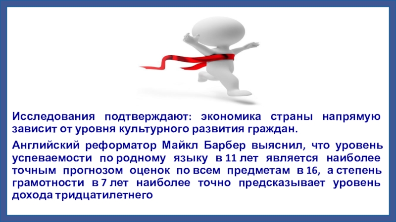 реформатор Майкл Барбер выяснил, что уровень успеваемости по родному языку в 11 лет является наиболее точным прогнозом оценок по всем предметам в 16, а степень грамотности в 7 лет наиболее точно предсказывает уровень дохода тридцатилетнего