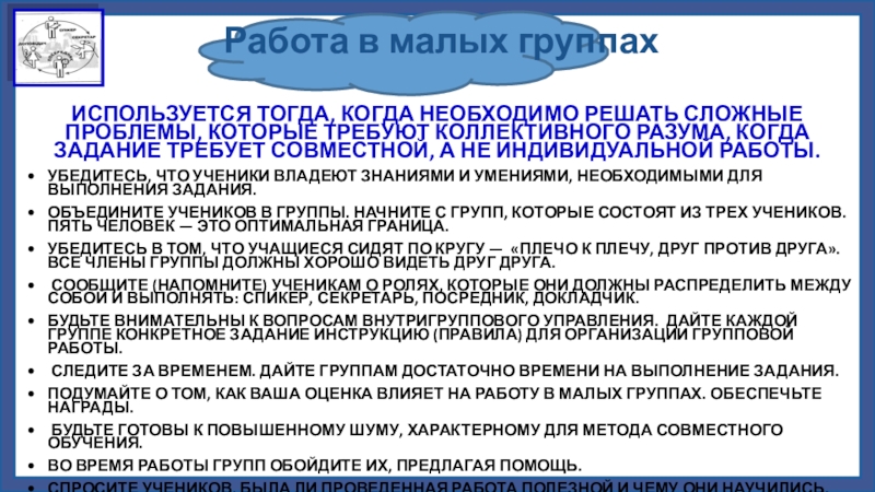 ИСПОЛЬЗУЕТСЯ ТОГДА, КОГДА НЕОБХОДИМО РЕШАТЬ СЛОЖНЫЕ ПРОБЛЕМЫ, КОТОРЫЕ ТРЕБУЮТ КОЛЛЕКТИВНОГО РАЗУМА, КОГДА ЗАДАНИЕ ТРЕБУЕТ СОВМЕСТНОЙ, А НЕ ИНДИВИДУАЛЬНОЙ РАБОТЫ.