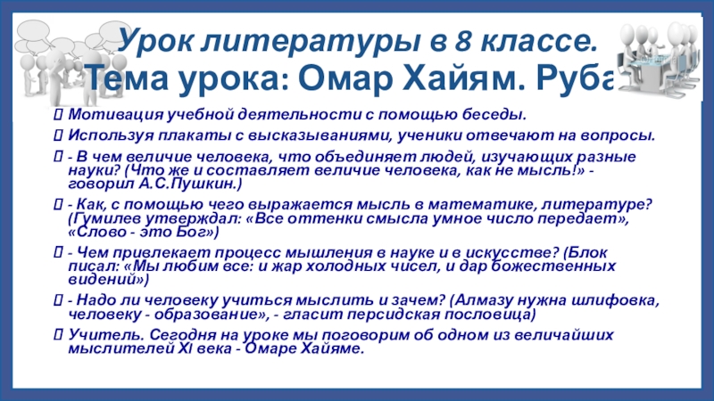 Учитель. Сегодня на уроке мы поговорим об одном из величайших мыслителей ХI века - Омаре Хайяме.